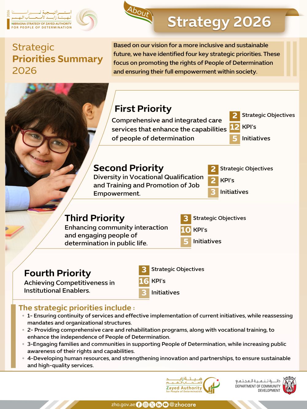 The strategic priorities for 2026 include ensuring the continuity of services and implementing current initiatives while reassessing mandates and the organizational structure; delivering comprehensive care and rehabilitation programs; supporting vocational training to reinforce the independence of People of Determination; engaging families and the wider community in supporting them; raising awareness of their rights and capabilities; and developing human resources while strengthening innovation and partnerships to guarantee sustainable, high-quality services.